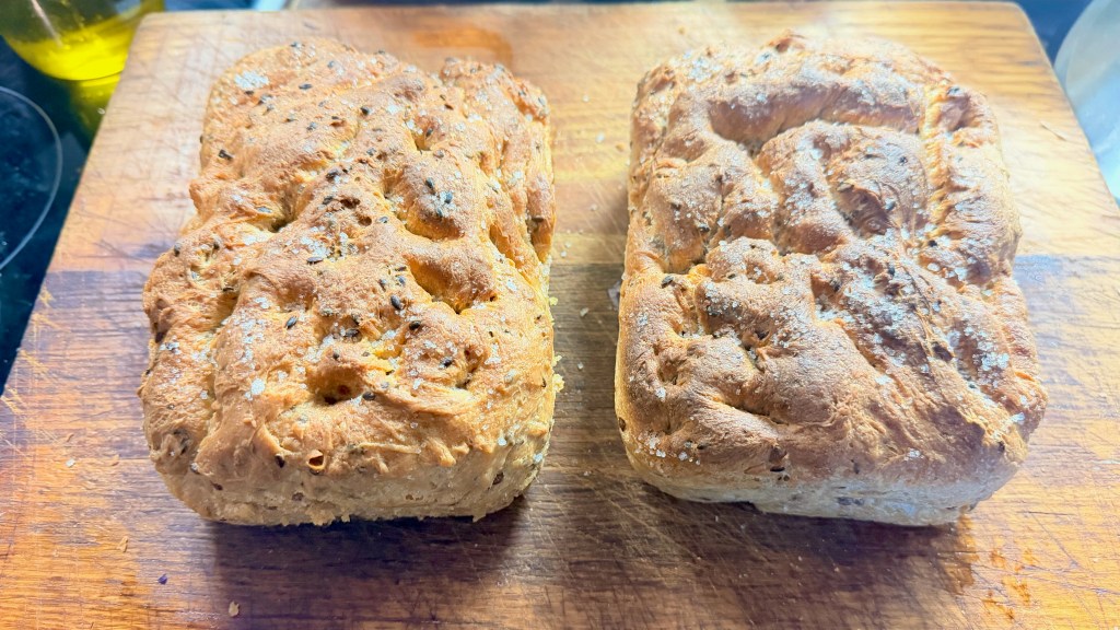 I cooked two focaccia-style loaves this afternoon, in the air fryer for the first time; the one on the left got 17 minutes after the one on the right came out slightly too cooked after 20 minutes. They both taste delicious. I used a multi-cereal flour, rather than a white flour, for health reasons and did the mixing in my bread machine. I hate kneading dough, it’s boring, my hands are acidic and kill yeast and it’s – for me – a waste of time, so I don’t do it. Please, if you enjoy it then you be you and pleasure yourself, as my students used to say. These I cooked in a one litre Pyrex dish in the air fryer; I’ll freeze one and eat the other tonight and tomorrow.