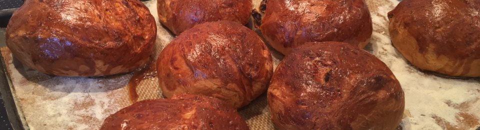 Anyway, one of the features of the school of my youth was the school Tuck Shop, a small room in the cloisters where we could queue up at 10.45 every morning to buy sticky currant buns. And very delicious they were too.I’ve had these buns in the back of my mind for the past 40 years, and have now succeeded in reproducing them pretty well, using a recipe for French brioche dough.Well, recipe; I exaggerate – I follow the instructions on the packet, mix it up in my bread machine (my old hands are too stiff to pound dough, what with the carpal tunnel problems and my innate laziness), form the dough into buns and pop them into the oven.Simples.